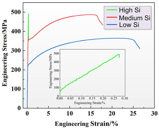 Tensile engineering strain–stress curves obtained at room temperature of the initial materials with different silicon content.