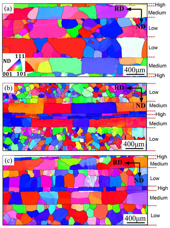EBSD IPF (inverse pole figure) map of the microstructure of the hot-pressed Si-gradient electrical steel composites: (a) PO-G sample, (b) CO-G sample, and (c) CR-G sample.
