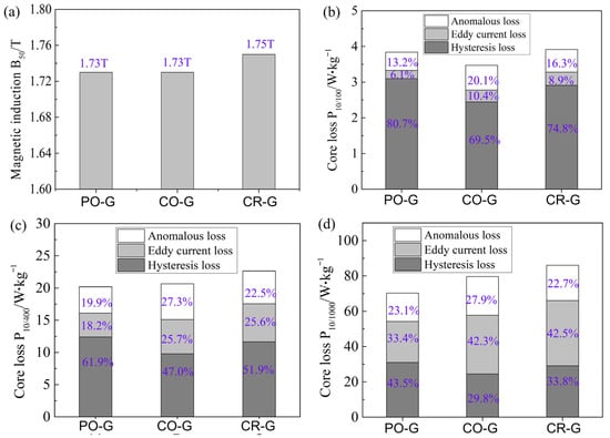 Figure 9 shows the magnetic induction B50 at 5000 A/m and the core loss separation at 100–1000 Hz and magnetic flux density of 1.0 T. The B50 values of the annealed PO-G and COG samples were 1.73 T, whereas the CR-G sample exhibited a slightly higher B50 value (~1.75 T). In terms of core loss at a frequency of 100 Hz, the total loss for all the samples ranged from 3.5 W/kg to 3.9 W/kg. The CO-G sample exhibited the lowest loss. At this frequency, the hysteresis loss accounts for about 70–80% of the total loss. As the frequency increased, the total loss gradually rose, with a decrease in the proportion of hysteresis loss and an increase in the proportion of eddy current loss. At this point, the PO-G sample demonstrated the lowest core loss, while the CR-G specimen exhibited the highest core loss. In addition, the PO-G sample also had the lowest eddy current loss. Overall, the annealed PO-G sample exhibited better magnetic properties at high frequencies. This is likely due to the high silicon concentration at the surface of the PO-G electrical steel, which enhances the surface resistivity and subsequently reduces the eddy current loss []. In addition, the core loss of the Si-gradient composites was higher than that of the initial medium- and high-silicon steel. This is mainly due to the existence of multiple layer interfaces that increase the hysteresis loss [].