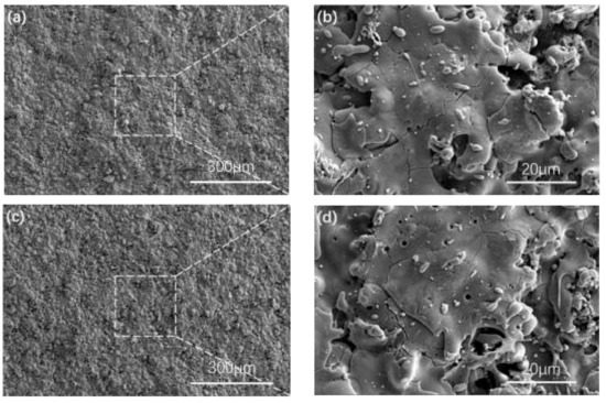 Figure 2a and Figure 2b, respectively, show the SEM images of the surfaces of the Al2O3 coatings (A coating) sprayed at the plasma power of 550 A spraying current, and Figure 2c,d, respectively, show the SEM images of the surface of the Al2O3/h-BN coatings (B coating) sprayed at the plasma power of 650 A spraying current. The surface morphology of the prepared coating is typical of atmospheric plasma spraying [24,25]. The surfaces of the Al2O3/h-BN coatings prepared by two different spraying currents under atmospheric plasma spraying are relatively uniform and smooth, which is caused by the characteristics of thermal spraying. The powder can be fully melted at extremely high temperature, so the microstructure formed is of high density. Under a high-magnification field of view, we can observe the appearance of micropores and small cracks on the surface of both coatings. The presence of such intrasplat cracks is a typical result of residual stress relaxation in ceramic coatings [26]. The reason for the formation of micropores is that the gas carried by the molten powder in the spraying process is sprayed onto the substrate and then cooled and solidified and discharged. The formation of small cracks occurs when the molten powder impinges on the substrate surface and the sedimentary layer and the droplets spread around and quickly spread on the surface, resulting in temperature difference and solidification shrinkage, and ultimately resulting in microcracks.