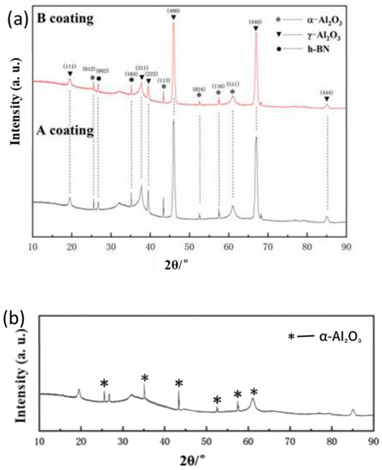 The Al2O3 in Al2O3/h-BN powder is mainly composed of α-Al2O3 phase, which is a stable phase. However, after the atmospheric plasma spraying, the inert gas ionizes into the ionizer under the action of arc, releasing a lot of heat, and changing the state of Al2O3 in this process. In the process of atmospheric plasma spraying, Al2O3/h-BN powder passes through the plasma jet outside the nozzle and is heated to a molten or semi-molten state. It impinges on the substrate constantly at a high speed, then jets to the substrate surface and rapidly accumulates, cools, and solidifies to form the coating. α-Al2O3 belongs to the tripartite crystal system; its structure is stable, and γ-Al2O3 is a face-centered cubic crystal system. Nucleation-free energy and cooling rate will affect the formation of crystal nuclei. According to the XRD pattern, in this process, alumina will transform from the thermodynamically stable α-Al2O3 phase to the metastable γ-Al2O3 state [31,32], which is due to the plasma-spraying conditions and the cooling process. Compared with the α-Al2O3 phase, the γ-Al2O3 phase has a lower specific surface energy [33]. When the temperature is lower than 1740 °C, the critical nucleation-free energy of the γ-Al2O3 phase is low, and it is easy to nucleate, but the nucleation ability of the α-Al2O3 phase is much weaker and is not easy to nucleate. Therefore, γ-Al2O3 is easier to nucleate from melt than α-Al2O3 [34]. The formation conditions of α-Al2O3 are relatively complex. After spraying, γ-Al2O3 is the main crystal-phase coating formed in the cooling process. Then in the cooling process, according to the different sizes, the cooling rates are different, different phases are formed. For larger size of alumina, cooling speed is slow, the local temperature is high enough, and part of the metastable γ-Al2O3 will gradually transform into steady α-Al2O3; however, the smaller size of alumina cools faster and forms metastable γ-Al2O3 until room temperature.
