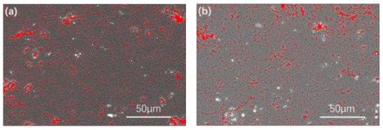 The porosity, microhardness, adhesion strength, and insulation performance of the coatings depend on the atmospheric plasma-spraying process parameters [35]. From previous SEM topography, it can be observed that the densifications of the middle and lower parts of the coating are better than those of the middle and upper parts, because the molten powder particles constantly impact the old sediment layer, resulting in a “shot peening treatment.” In ceramic coatings, pores are composed of pores and cracks of various shapes, sizes, and orientations [36]. There are many methods to measure porosity, including the weighing method, image method, and so on. According to the SEM coating photos that were analyzed and processed, the porosity of the coatings were measured by an imaging method using Image J software [37]. As shown in Figure 6, the red area is the pore area. After calculation, the porosities of coatings A and B are 6.04% and 4.75%, respectively. The results show that the microstructure of the B coating is more compact than that of the A coating. Compared with pure alumina coating, a coating with fewer and smaller pores and better performance was prepared. Pore defects will affect the mechanical and adhesion strength of the material.