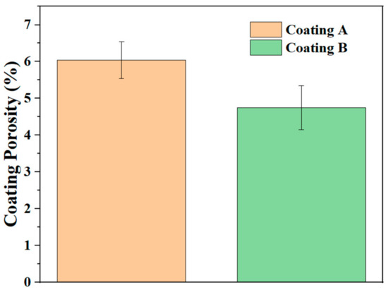 The calculated porosity volume fractions of coatings A and B obtained under different plasma-spraying currents are shown in Figure 7. Therefore, both the A and B coatings under this spray current are very dense, as observed in the SEM morphology. The porosity of the B coating is 1.29% lower than that of the A coating. The coating is formed by the accumulation of molten droplets. With the increase in plasma-spraying current, the spraying power, spraying speed, and deposition temperature also increase. These increases indicate that at higher plasma power, the complete melting of the particles and the higher velocity give the coating a smaller porosity and better interfacial bond strength.