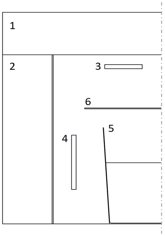 Axisymmetric simulation domain consisting of top insulation (1), lateral insulation (2), top heater (3), side heater (4), crucible (5) and heat shield (6).