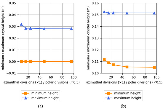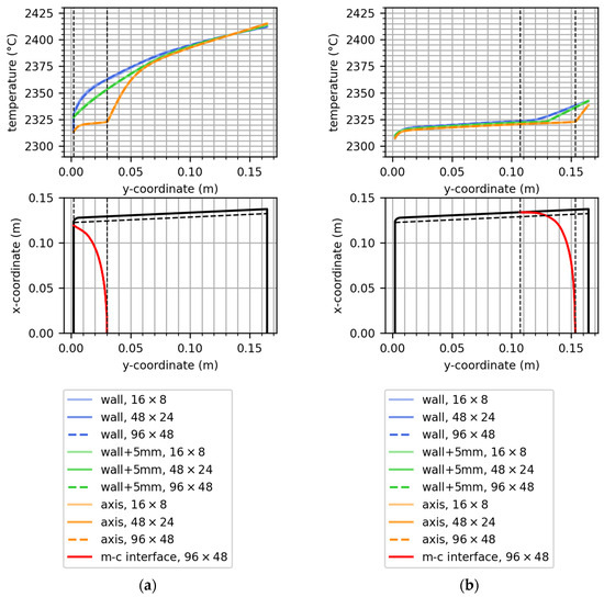 The refinement of the angular resolution is monitored via the height of the m-c interface at the axis and at the crucible wall (Figure 3). In the seeding stage, the height at the axis remains relatively constant at angular resolutions of 24 × 12 and higher. The m-c interface meets the crucible wall at the bottom; hence, a constant height is observed. In the stage with almost completed solidification, the height of the m-c interface in the axis remains constant at resolutions of 16 × 8 and higher. The m-c interface height at the wall, however, is found to change up to an angular resolution of 48 × 24. The m-c interface and the crucible wall meet at a flat angle, which leads to a wedge-shaped zone of liquid sapphire separating the crucible wall from the sapphire crystal. The near-wall zone displays higher sensitivity to the angular resolution compared to the other regions of the m-c interface. The selection of the appropriate angular resolution depends first and foremost on the purpose of the underlying study. Detailed analysis of the m-c interfaces requires correspondingly high angular resolutions. A fine angular resolution is also required in the context of locally resolved heat flux analysis due to the difference in thermophysical properties between crystal and melt. Secondly, also the computational efficiency is a relevant factor. The angular resolution of the finite volume radiation model is a major determinant of the computation time. As for example, the evaluation of the model with an angular resolution of 96 × 48 and a mesh size of 0.5 mm in the sapphire zone requires an average total wall-clock time of 3.89 s per iteration on a High-Performance Computing (HPC) workstation with AMD processors (x86_64 architecture), whereby 40 processors were used for the calculation. A reduction in the angular resolution to 16 × 8 (while maintaining the mesh size of 0.5 mm) reduces the computation time to 0.18 s per iteration. In comparison, also the influence of the mesh size was studied. Applying an angular resolution of 16 × 8 in combination with a coarsening of the mesh to an element size of 3 mm in the sapphire zone, which reduces the overall element number from 122,261 to 31,235, leads to an average computation time of 0.08 s per iteration.