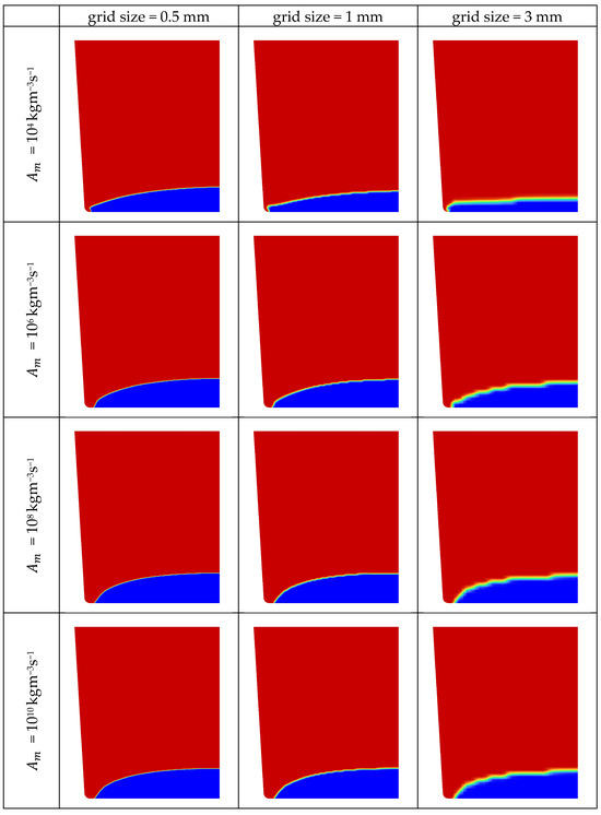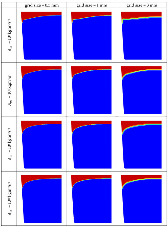 Based on the investigation of the angular resolution of the finite volume radiation model and the focus on the screening of a high number of grid sizes and mushy zone parameters and their interaction rather than on the near crucible wall region of the m-c interface as well as due to considerations of computational efficiency, an intermediate angular resolution was selected. In accordance with [9,19,21], 16 × 8 was chosen as an angular resolution for the study of the combined influence of grid and mushy zone parameter. The mushy zone parameter was varied between 104 kgm−3s−1 and 1010 kgm−3s−1. The considered grid sizes in the sapphire zone were 0.5 mm, 1 mm and 3 mm. Two stages, the seeding stage (Figure 4) and the stage where the solidification is almost completed (Figure 5), were investigated. In general, the size of the fixed grid controls the interface resolution. The thickness of the interface increases with grid size. In addition, a coarse grid leads to a stair-step structure of the m-c interface, which prevails at all investigated mushy zone parameters. With lower grid sizes, the m-c interface becomes smoother and the influence of the grid size decreases. When analyzing the influence of the mushy zone parameter in the seeding stage at the highest mesh resolution, significant differences in the shape of the crystal between high and low mushy zone parameters are observed. These differences relate to the zone of the m-c interface around the axis and to a higher degree to the zone where the m-c interface meets the bottom wall of the crucible. The m-c interface is slightly convex near the axis. The maximum height of the interface increases with increasing mushy zone parameters. The angle at which the interface meets the bottom wall of the crucible changes from obtuse to acute at a mushy zone parameter of 106 kgm−3s−1.