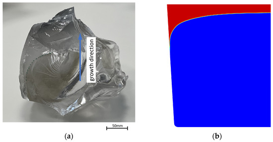 A reference for the features of the shape of the m-c interface is obtained from an industrial HEM growth process. Specifically, the applied growth process uses the FAMETEC McSap technology EP4271856A1 [31] and WO2023212765A1 [32], which is based on the HEM method of crystal growth from the melt phase. In this process, raw Alumina material is placed on top of a crystal seed of the orientation of interest. The heater power is ramped up to achieve melting while the bottom of the crucible is subjected to cooling to protect the seed from complete melting. When melting proceeds till full melting of Alumina raw material and partial melting of the seed, the process is reversed to solidification by carefully ramping down the heaters and strengthening the cooling flux from the crucible bottom surface. As illustrated in Figure 1, the growth is conducted in the presence of both top heaters and side heaters with which under the specific hot zone design of the furnace, the control over the axial/radial temperature gradient—determining the interface shape—is fulfilled. At the end of the growth, a careful power ramp down to the room temperature is carried out. The process was halted by a power shutdown. Subsequent to full solidification and cooling down to room temperature, the sapphire boule was analyzed as shown in Figure 7. The analysis procedure essentially follows the method for the extraction of an intermediate-stage m-c interface of a sapphire single crystal proposed by Qi et al. [19]. The region above the m-c interface was mechanically removed in parts by applying sawing and chiseling, which is facilitated by the lower strength of the rapidly solidified liquid compared to the single crystal below. The rapid cooling reveals the m-c interface, which is highlighted by the dashed line in Figure 7a. The m-c interface shows a rounded shape, which is flat and almost horizontal near the axis of the boule. Towards the side wall of the crucible, it displays a convex curvature and meets the side wall at a flat angle. These features are observed in the simulations with a high angular resolution for radiative transport (16 × 8), a fine grid in the sapphire zone (0.5 mm) and a high mushy zone parameter (108 kgm−3s−1). The m-c interface obtained from the simulation is shown in Figure 7b.
