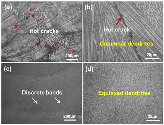 Figure 2 shows the longitudinal cross-sectional morphologies of as-fabricated CW and PW samples. The typical layer-by-layer manufacturing characteristics can be observed, and the white arrow indicates the layer band. In each layer, there are some fuzzy and curved banded structures, which are randomly distributed with uneven spacing. The formation of these banded structures is mainly attributed to the fluctuation of the molten pool caused by the powder feeding airflow or powder during LAM. The CW sample is dominated by columnar dendritic clusters with growth direction deviation. Each dendritic cluster is composed of columnar dendrites with the same growth direction. The average dendrite arm spacing is about 5.8 μm. In addition, there are a large number of microcracks in the deposited layer, especially at the interfaces of adjacent dendritic clusters with large differences in growth directions (Figure 2b). In fact, these interfaces are grain boundaries in nature. During the non-equilibrium rapid solidification of LAM, the element segregation and eutectic phase formation are inevitable. In addition, the rapid heating and cooling of the molten pool lead to high thermal stress in the forming process. High thermal stress and low-melting-point eutectic phase will increase the hot cracking sensitivity and then result in hot cracking [25,26].