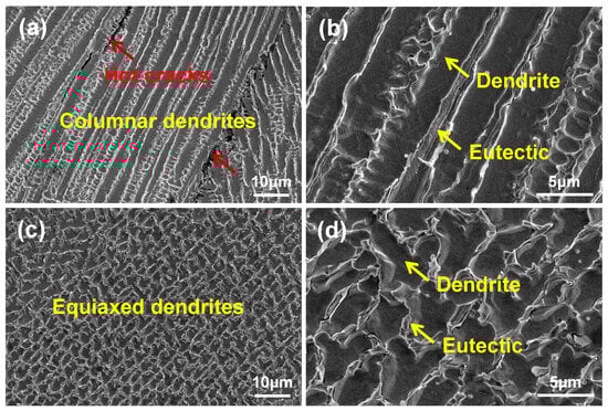 Figure 3 shows typical SEM images of the two samples. Similar to the dendrite morphology in OM images, the CW sample is dominated by columnar dendrites, and there are obvious thermal cracks in the interfaces of adjacent columnar dendrite clusters (Figure 3a). The dendrite cluster is mainly composed of dendrite matrix and interdendritic eutectic. Many chain-like phases are embedded in the eutectic structure (Figure 3b). In fact, these chain-like phases are identified as eutectic phases. For the PW sample, the microstructure is mainly composed of equiaxed dendrites and interdendritic eutectic (Figure 3c). Fine discrete particles are embedded in the eutectic structure (Figure 3d).