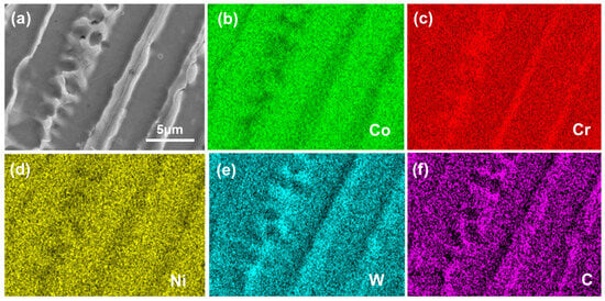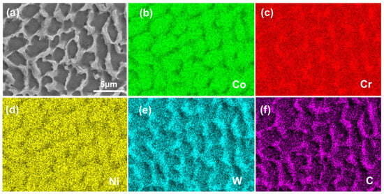 Figure 5 shows the secondary electron morphology and the corresponding element distribution of the PW sample. The PW sample is mainly composed of equiaxed dendrites, and the eutectic region is poor in CO and Ni elements but rich in Cr, W, and C elements. Compared with the linear element distribution in the CW sample, the elements in the PW sample are distributed in a network-like pattern, which is beneficial to the homogenization of elements. The above results show that the dendrite growth mode has an important influence on the segregation mode of the as-deposited samples.