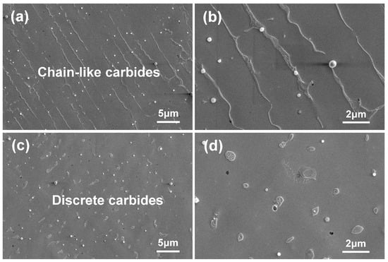 In order to further quantitatively study the composition and quantity of the eutectic phase, the sample was electropolished to expose the eutectic phase. Figure 6 shows the typical SEM morphology of the CW and the PW samples after electropolishing. In the CW sample, most particles are linearly distributed (Figure 6a,b). In contrast, fine and discrete particles were observed in the PW sample (Figure 6c,d). In order to further understand the relationship between particles and processing technology, the volume fraction of particles in the sample was estimated by SEM image analysis. The particle volume fraction of the CW sample was about 5.88% ± 1.12%, which was significantly higher than that of the PW sample (4.12% ± 0.96%).
