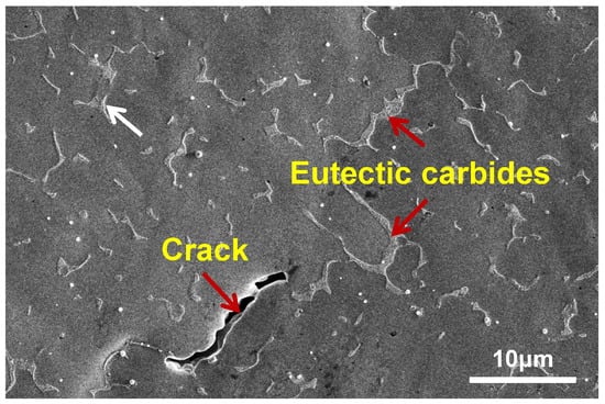 Figure 7 shows the typical SEM morphology of the CW sample after electropolishing. Two regions with different contrast can be observed. The difference in contrast is due to the different orientation of dendrites. Coarse and irregular chain-like eutectic phases can be observed at the interface (grain boundary), while irregular particles with small size can be observed at other zones, indicating the more severe segregation and coarser eutectic phase at the interface than at the interdendritic regions. In addition, cracks can be observed in the local region of the interface due to the shedding of the chain-like eutectic phase. Near the crack, there is usually severe element segregation and liquid film. Although eutectic structure exists in the grain boundary and interdendritic region of the sample, the liquefaction cracking behavior tends to occur at the grain boundary. This is because the orientation difference angle on both sides of the grain boundary is large, while there is no or very small orientation difference angle on both sides of the branch grain boundary. The larger difference in the angle of the grain orientation results in a greater difference in the solidification shrinkage degree between adjacent grains, which aggravates the cracking of the liquid film [27].