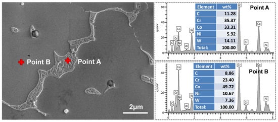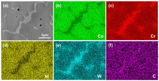 Figure 8 shows the SEM-EDS point analysis results of the coarse and long-chain-like phase. The results show that the content of Cr, W, CO, and Ni in long-chain particles is 35.37%, 14.11%, 33.31%, and 5.92%, respectively. It can be seen that the long-chain-like particles are rich in Cr and W and poor in Co and Ni. In contrast, the Cr and W in the matrix are 23.40% and 7.36%, respectively, which are significantly lower than those of long-chain-like particles. According to its composition and morphological characteristics, this long-chain particle is usually identified as M23C6 phase, which is also confirmed in reference [6].