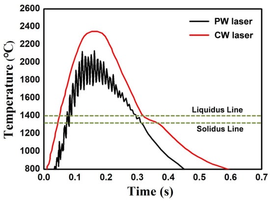 Figure 10 shows the temperature variation curves of the molten pool under two different laser processing modes. During CW-LAM, the temperature rapidly rises to the peak temperature of 2362 °C and then rapidly cools to below the melting point. The temperature curve of the molten pool is relatively smooth. Compared with the CW-LAM, the molten pool temperature under PW laser processing mode exhibits periodic oscillation due to the periodic laser energy input. It is noted that the molten pool temperature curve of PW laser processing mode is enveloped by that of CW-LAM, indicating a shorter thermal cycle and faster cooling under PW laser processing mode.