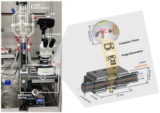 A special feature of the setup was the analytical bypass for non-invasive examination of the crystallization progress in the DTBC. The suspension was pumped in a loop with a LabDosTM-P-Easyload from HiTec ZangTM (Herzogenrath, Germany) at a flow rate of 5 mL min-1 through the fluorinated ethylene propylene (FEP) tube with an inner diameter of 1.6 mm and flowed back into the DTBC at the bottom. The flow rate was chosen to avoid motion blurring on the images. Due to the temperature dependence of the solubility of l-alanine in water, a tube heater was implemented around the FEP tube. The entire setup is shown schematically in Figure 1. The list of all devices used can be found in the Supplementary Materials, Table S2.