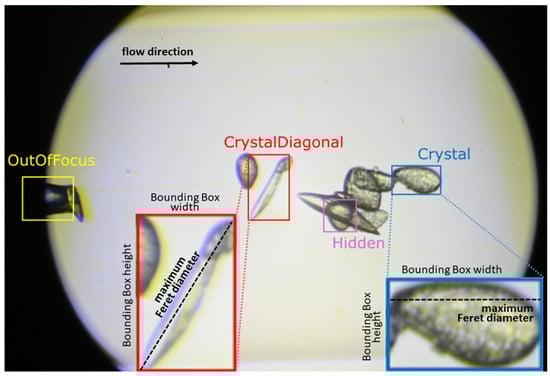 As the crystals in YOLOv8 were marked by bounding boxes, the longest side of the bounding box was determined as the Feret diameter, according to [33]. Due to the irregularly shaped crystals, a deviation from the actual length of approx. 8% occurred. By introducing the CrystalDiagonal class, a non-parallel orientation of the crystal to the flow direction was considered, and the Feret diameter was calculated on the basis of the diagonal using Pythagoras’s theorem. Thus, the systematic error could be reduced to 6%. Figure 2 shows the schematic labeling for both classes of crystals for YOLOv8.