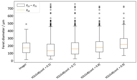 The inability to detect crystals in the range of 0–25 μm describes a physical limit of the YOLOv8 model. This is due to the decreasing number of pixels representing the crystals, with the 50 µm crystal images being only 100 pixels in size. Nevertheless, as these crystals are included in the image analysis, the shift of the lower quartile to larger crystal sizes can be explained. With increasing confidence, smaller crystals are less recognized, until no crystals are detected anymore for a confidence level of 0.9. For this reason, the distribution shifts to larger crystal sizes with increasing confidence.