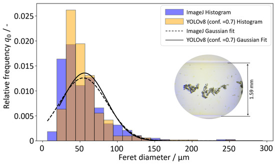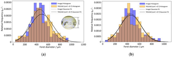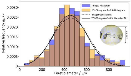 In order to investigate the influence of larger crystal sizes on the detection of the CSD, the crystal size range of 250–630 μm is considered. The relative frequency histograms of ImageJ and YOLOv8 (conf. = 0.7) are shown together with the Gaussian fit in Figure 4 to compare the crystal sizes. Here, the blue bars represent the ImageJ baseline, the yellow bars represent the YOLOv8 distribution, and the orange bars reflect the shared area.