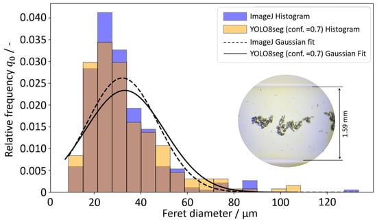 For the comparison of the determined CSDs, the focus was placed on the best confidence levels in the crystal size class 250–630 μm in order to depict the greatest possible potential of the models. Figure 10 shows the two histograms of YOLOv8 at a confidence level of 0.7 and YOLO8seg at a confidence level of 0.9. The blue bars represent YOLOv8 and the orange bars represent the YOLO8seg. The common areas are shown in brown. In addition to the two Gaussian fit curves of the models, the Gaussian fit of the ImageJ distribution is also shown.