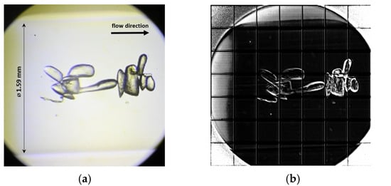A Nikon Z6-II camera (Nikon, Japan) was used to photograph the crystal suspension. For a compromise between contrast and motion blur, a fixed value of ISO 2000 and a shutter speed of 1/3200 were selected. Since crystal sizes up to 650 μm were examined for the training, an 8× magnification was set for the images using the Bresser Advanced ICDTM microscope (Bresser GmbH, Rhede, Germany). Further information about the camera setup and the calibration are given in the Supplementary Materials, Section S3 and Figure S4.