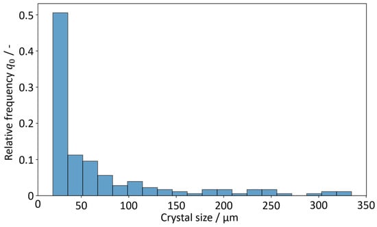 The crystals were produced by grinding and classified by sieving. Since sieving does not represent an exact separation of the crystal sizes, it must be assumed that only a large proportion of the crystals in the bulk belong to the respective crystal size range. Each crystal size range was individually photographed in suspension. Therefore, a 200 mL crystal suspension of the respective crystal size range was prepared at 20 °C at least 12 h before the experiment with a weight fraction of the solid of 5.0 wt.% l-alanine (wala). Before adding the crystals, the saturated solution was filtered twice at a mesh size of 10 µm. In addition to the influence of the crystal size, the influence of the weight fraction of the solid phase on the performance of the photometric crystal size analysis was investigated. The higher the solids content, the more the crystals tend to overlap. Accordingly, the performance of the analysis is expected to decrease if the solids content increases. Therefore, suspensions with mass fractions of wala = 1.0, 2.5, 5.0, and 7.5 wt.% were also examined in further experiments for each crystal size range. The table correlating each mass fraction to the corresponding mass added can be found in Supplementary Materials Table S6.