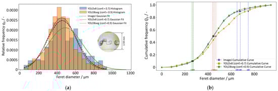 Relative frequency from the YOLOv8 model (conf. = 0.7) of crystals assigned to the Crystal class (crystal size range: 250–630 μm) compared with ImageJ: (a) considering the systematic error; (b) with a corrected systematic error of 6%.