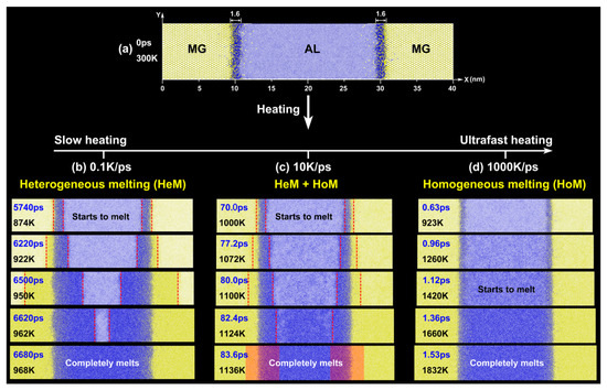 At ultrafast heating rates such as 1000 K/ps (Figure 1d), all regions of the nanolayer simultaneously change into disorder structures, illustrating that the melting starts in every local region. In other words, melting nuclei are uniformly distributed across the entire nanolayer. Such a melting process presents two notable features: (i) the nanolayer is highly superheated with a complete melting temperature of up to 1420 K (485 K above the of pure Al) [29], and (ii) the melting time, from the beginning to the moment when the nanolayer completely melts, is as short as 1.53 ps, which is consistent with the predictions for the homogeneous melting (HoM) process [30,31]. The uniform order to disorder structural change and the short melting time indicate that the melting is governed by homogeneous nucleation at such heating conditions.