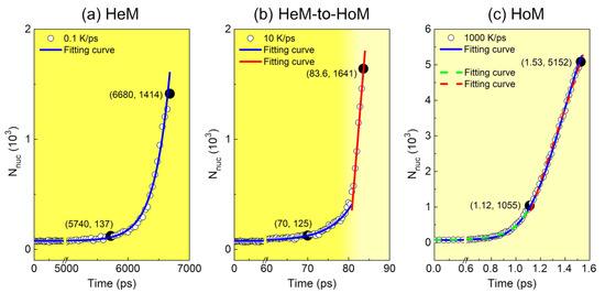 In the case of HoM, homogeneous nucleation plays an absolutely dominant role, but heterogeneous nucleation still occurs in this regime. Thus, the varies in two modes, depending on whether one takes heterogeneous nucleation into consideration. In the mode including heterogeneous nucleation, the increases with time via Functions (4) and (5), similarly to that in the case of the HeM to HoM regime, as separately indicated by the green and red dashed lines in Figure 3c. The difference is that equals , the time when the nanolayer starts to melt. In the mode excluding heterogeneous nucleation, the polynomially increases with time by the new Function (6) throughout the entire melting process, as indicated by the blue curve in Figure 3c,