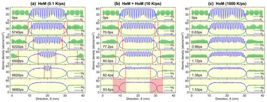 Sequential snapshots of time-resolved structures and high-energy atoms (potential energy, , is −1.0 eV or larger) at the left side of the Mg layer at different heating rates: (a) 0.1 K/ps, (b) 10 K/ps, and (c) 1000 K/ps. Red spheres are the high-energy atoms. Small spheres are Mg atoms, and the larger ones are Al atoms.