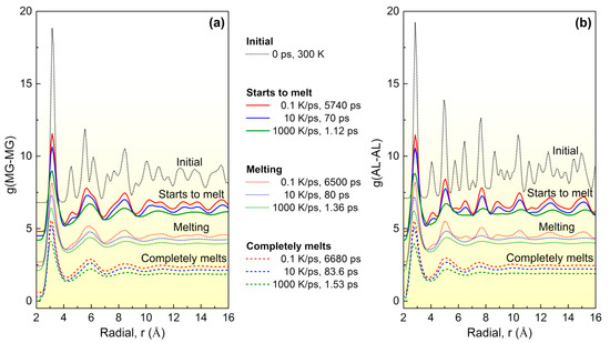 Radial distribution functions (RDFs) of (a) Al atoms and (b) Mg atoms from the statistical averages over the entire nanolayer.