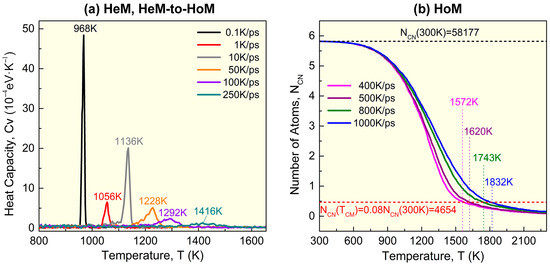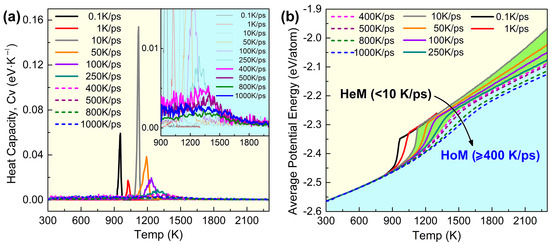 At melting points, structures and system energies generally fluctuate, exhibiting a sharp peak or an inconsecutive point in the structure or energy function, such as the curves of the Lindemann index, potential energy, and system heat capacity varying with temperature. Priority here was given to the heat capacity curve that shows a high peak at the melting point and has been extensively used in experiments and MD simulations. The heat capacity curve shown in Figure 6a shows an observed peak only at < 400 K/ps, indicating the following: (i) the Mg-Al nanolayer exhibits a complete HoM process at ≥ 400 K/ps, and (ii) the measurements of melting points via heat capacity curves are suitable only for HeM and HeM to HoM processes, rather than for HoM processes.