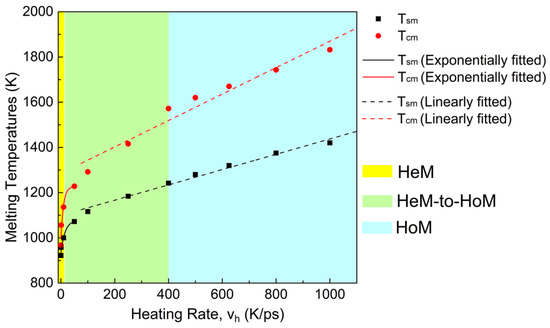 - The HeM to HoM transition is also predicted in a single melting process at a heating rate on the intermediate scale, except for the reported observation of the transition from slow heating rates to ultrafast heating rates.