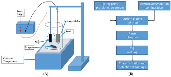Three sets of polished samples were coated from bath containing the following constituents: 250 g/L NiSO4·6H2O, 45 g/LNiCl2·6H2O, 35 g/L H3BO3, 1-g/L Saccharin, and 1 L H2O 18. Bath 1: nanoparticles were not added; Bath 2 (20 g/L): 250 nm TiO2 nanoparticle; and Bath 3 (20 g/L): 30 nm TiO2 nanoparticle. A schematic of the coating process is shown in Figure 1A. The electrodeposition was carried out in a 250 mL glass beaker (see Table 2). The coating parameters, such as a current density of 5 A/dm2 and a deposition temperature of 50 °C, were optimised in a previous study [29]. The scientific literature shows that while electroplating has many advantages in protecting the surfaces on which the coating is deposited, the strength of the coating/substrate interface often limits the application to low-load-bearing surfaces. The application of a second step using the high-temperature arc generated during TIG welding is expected to melt and fuse the coating to the surface of the steel substrate.