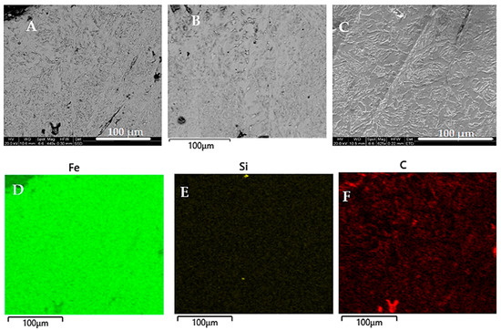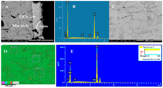 The composition of the treated steel surface was characterised by laser-induced breakdown spectroscopy (LIBS), and the spectrum is shown in Figure 7. The results of the LIBS analysis show that in addition to the elements present in the base metal, as shown in Table 1, there were also strong peaks for Ni and Ti. Further analysis of the samples coated with Ni containing 30 nm TiO2 particles using a scanning electron microscope (SEM) revealed a fine plate-like grain structure throughout the treated region, as shown in Figure 8A–C. Small grain size may improve mechanical properties such as strength and toughness. EDS mapping of the treated surface confirms that in addition to the elements, such as C, Fe, Si, and Mn, present in the base metal, the EDS maps also highlight the presence of silicon (Si) in the sample. The distribution appears uneven, with higher concentrations in certain regions. Silicon can improve the mechanical properties of steel, such as strength and hardness. However, uneven distribution may lead to localised variations in properties.