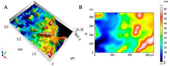 Wear scar of the sample coated with Ni-30 nm TiO2 particles: (A) depth of the wear scar of sample coated with Ni coating and treated with tig arc; (B) LIBS topographical map of the wear scar of the sample coated with Ni-30 nm TiO2 particles and treated with tig arc.