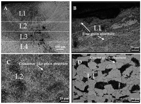 (A) Optical microscopic image of the cross-section of a sample coated with Ni containing 30 µm TiO2 particles coatings obtained using 75 A current at a travel speed of 2 mm/s. (B) Grain size variation within region-L4. (C) Detailed view of region-L2. (D) Detailed view of the microstructure of region-L4.