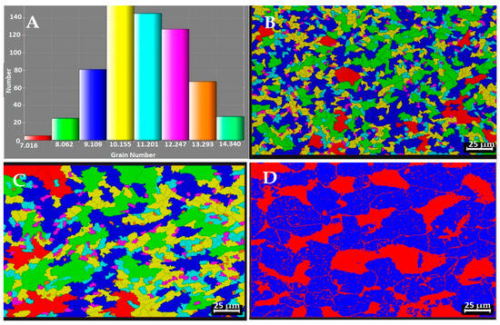 The microstructure shows a variation in the grain structure of the sample, moving from the immediately treated surface towards the sample’s centre. Several distinct regions were identified in both samples coated with Ni containing 30 µm TiO2 particles and those coated with Ni containing 250 µm TiO2 particles. The variation in the grain size from the bulk material to the treated layer shows a significant reduction in grain size in all samples treated. However, the samples containing 30 µm TiO2 particles experienced the most significant grain size reduction. The high temperature reached and the melting and mixing of the coating constituents into the base metal leads to the formation of fine microstructure. As the depth from the surface layer increases, the size of the grains increases, as illustrated in Figure 6B–D, which are closer in size and shape to the base metal microstructure. The results are consistent with the expected temperature profile generated across the samples treated. The grain size variation across the treated sample is summarised in the frequency chart provided in Figure 6A. Grain refinement is a key strengthening mechanism in steel’s surface treatment. The solid solution elements from the Ni coating and TiO2 nanoparticles can also promote grain refinement by inhibiting grain growth during processing. This results in a finer grain size, strengthening the steel through the Hall–Petch effect, which shows that the change in the hardness of a material is inversely proportional to the square root of the grain size. This means that a finer grain size results in a higher hardness [30,31,32].