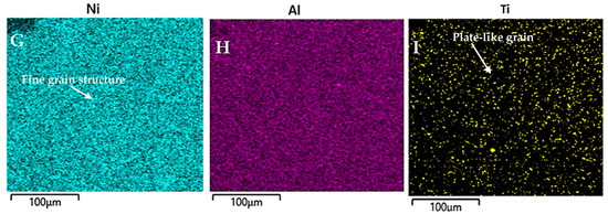 (A–C) SEM micrograph showing the cross-section of the coated steel surface. EDS map confirming the composition of the treated layer: (D) Fe; (E) Si; (F) C; (G) Ni; (H) Al; (I) Ti.