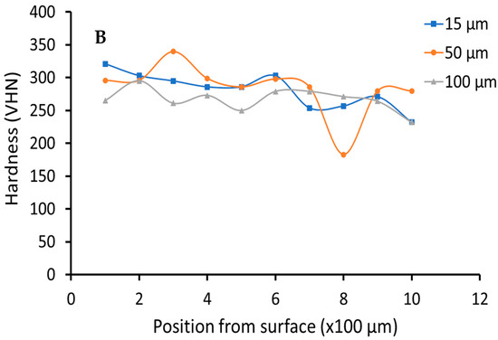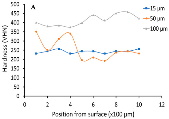 The mechanical changes due to modification of the composition within the treated layer as a function of the thickness of the electrodeposited coating are presented in Figure 9A. The graph shows the hardness profile along the cross-section perpendicular to the treated surface of the sample. The sample coated with Ni had a maximum hardness of 250 VHN, which reduced to 240 VHN at 0.5 mm depth and continued reduction to 220 VHN at 1 mm. When 30 nm TiO2 particles were co-deposited into the coating and impregnated into the treated surface, the hardness of the treated surface fluctuated between 375 VHN and 451 VHN. The hardness profiles demonstrate a clear trend of decreasing hardness with increasing depth from the surface. The sample coated with the 100 µm thick coating exhibits the highest hardness, indicating a surface treatment or layer with enhanced mechanical properties. When the coating thickness was increased to 15 µm and 50 µm, profiles showed a more gradual decrease in hardness, suggesting a potential transition zone between the surface layer and the bulk material (see Figure 9B).
