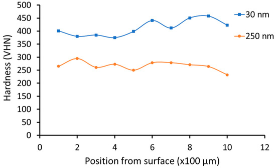 The reduction of the nanoparticles’ size has also positively impacted the hardness of the treated layer. The results showed that the sample prepared with 30 nm with a thickness of 120 µm produced the surface with the highest hardness of 451 VHN. Meanwhile, samples prepared with 250 nm TiO2 particles produced a hardness of 300 VHN for similar coating thickness.