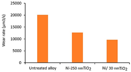 The wear rate of the sample coated with Ni-250 nm TiO2 particles was approximately half that of the untreated surface. When 30 nm TiO2 nanoparticles were co-deposited with the Ni matrix, the wear rate decreased by another 10%. The results confirm that the inclusion of finer nanoparticles positively impacts the wear rate of the sample.