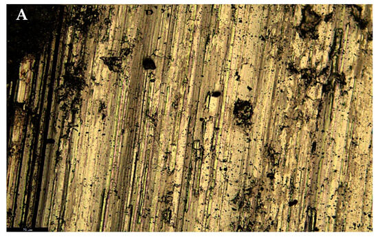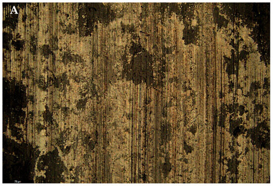 The worn surface of the Ni-250 nm TiO2 sample is presented in Figure 12A. The optical micrograph contains a series of parallel lines indicative of abrasive wear. Additionally, the image had several dark sections where it appeared that sections of the coatings had been removed during the wear-testing process. The wear scar appears as a series of parallel lines or grooves across the surface. The lines are dark in colour and are surrounded by a lighter-coloured background. There are also some small, dark spots scattered throughout the wear scar. Based on the appearance of the wear scar, the most likely mode of wear is abrasive wear. Abrasive wear occurs when hard particles or asperities come into contact with the surface and scratch or gouge the material. The parallel lines in the wear scar indicate abrasive wear, likely caused by hard particles rubbing against the surface.