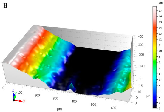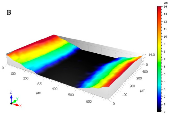 Compared to the sample coated with Ni-30 nmTiO2 and treated with TIG arc, the worn surfaces contained similar parallel groves, indicative of abrasive wear (see Figure 13A). Large fibrous regions were observed where large coating sections were removed during the wear test. However, the depth of the wear track was approximately 14 µm. The difference observed in the wear track’s depth, and the samples’ wear rate confirmed that the treated surface experienced greater wear resistance than the untreated surface. Like the Ni-250 nmTiO2 sample, the wear scar appears as a series of parallel lines or grooves running across the surface. The lines are dark in colour and surrounded by a lighter-coloured background. There are also some small, dark spots scattered throughout the wear scar. Based on the appearance of the wear scar, the most likely mode of wear is abrasive wear. Small, dark spots suggest that some material may have been removed from the surface during the wear process.