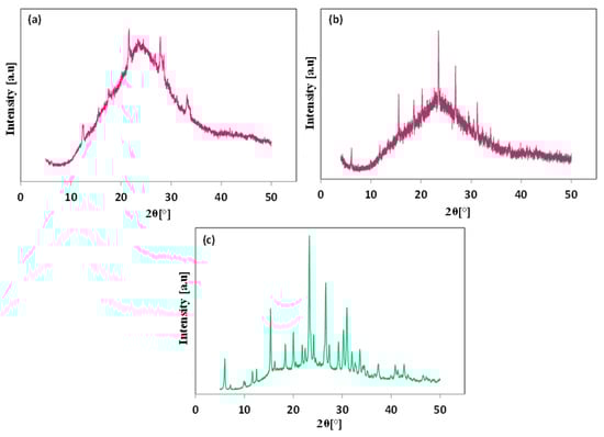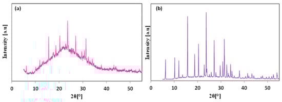 To investigate the effect of an organic structure-directing agent (SDA) on the crystallization of zeolite Y, we first synthesized a sample using the original synthesis procedure without incorporating any organic molecules as an SDA [16]. The only modification was the addition of resin beads as a shaping template, with an initial suspension/resin mass ratio set at 20:1 (see SEM images in Figure 1 for dimensional and textural properties of resin template) [14]. The XRD analysis results, presented in Figure 2a, show a semi-crystalline phase with characteristic peaks of zeolite Y for the spherical particles obtained through the hard templating technique. For comparison, the crystalline powder obtained from the same synthesis batch is shown in Figure 2b. The observed amorphization of the precipitated phase on the resin surface and the absence of organic SDA are likely due to the competitive rates of precursor deposition within the resin’s porous structure. This discrepancy limits the ordered alignment of precursors. Additionally, the resin template’s chemistry differs from that of the initial suspension and the bulk of the formed zeolite, while its porous structure partially imposes steric hindrance, affecting the movement and alignment of the precursors in an orderly fashion.