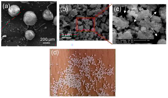 In different experimental batches, we examined the influence of organic ammonium salts such as tetramethylammonium hydroxide (TMAOH), tetraethylammonium hydroxide (TEAOH), and tetrabutylammonium hydroxide (TBAOH) on the crystallization of zeolite Y using synthesis method 2 (see Section 2.2.2). In all experiments, the aging duration was fixed at 5 days, and crystallization was carried out under a single-step temperature program at 100 °C for 72 h. The XRD patterns of the samples are presented in Figure 3. The addition of TEAOH or TBAOH showed lower affinity for interacting with inorganic precursors to form the characteristic pores and cages of zeolite Y, resulting in a significant amount of amorphous phase as a competing product (Figure 3a,b). These patterns indicate that the zeolite Y framework was not well-formed under these synthesis conditions with TEAOH and TBAOH as SDAs. In contrast, TMAOH resulted in the highest degree of crystallinity for the zeolite Y beads under the same conditions, with significantly reduced amorphous phases, as confirmed by XRD analysis (Figure 3c) [18]. The textural properties of the obtained spherical particles have been shown by SEM imaging (Figure 4a–c). The spherical geometry of obtained zeolite Y particles (particle diameter <1mm) can be seen with naked eyes (Figure 4d). The hierarchical structure of zeolite Y beads have been also proved by N2 physisorption (see Figure 5a) in which a hysteresis loop appeared at ca. p/p0 > 0.9 indicating that large mesopores and macropores are present inside the material. The pore size distribution is presented in Figure 5b, indicating the presence of large mesopores with a pore width < 40 nm and pore volume of 0.5 cm3/g.