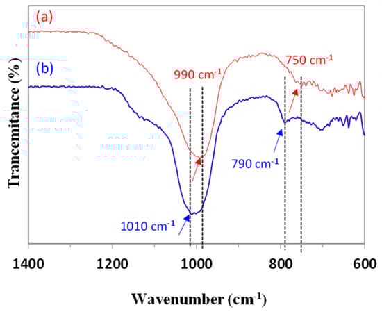 To further investigate the structural properties of the zeolite Y beads synthesized using TMAOH, the FTIR spectrum of this sample was obtained and compared with that of fully crystalline zeolite Y powder (refer to Figure 1b for the XRD pattern). In the FTIR spectra (400–1400 cm−1), both samples exhibited transmission bands corresponding to the symmetric and asymmetric stretching of T-O-T bonds at approximately 750–790 cm−1 and 990–1010 cm−1, respectively, where “T” denotes either Si or Al atoms. As shown in the FTIR spectra (Figure 7a,b), the spherical zeolite Y particles exhibited a shift in the characteristic peaks towards lower wavenumbers compared to the reference crystalline Y powder. This shift is likely due to differences in the chemical composition between the two samples [20]. This finding is further supported by XRF measurements, which are discussed in the following section.