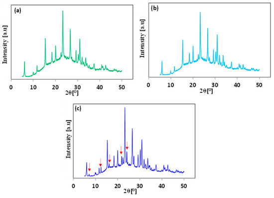 The XRD pattern of zeolite Y beads aged for (a) 6 days, (b) 7 days, and (c) 8 days using hydrothermal treatment using single temperature program at 100 °C for 72 h. The red arrows indicate the peaks belonging to zeolite p and zeolite L.