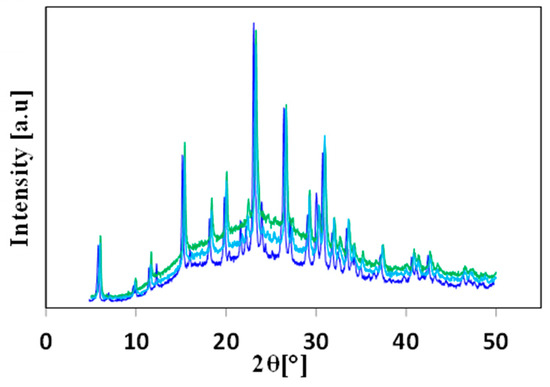 The stacking XRD spectra of aged zeolites beads (green: 6 days, light blue: 7 days, and dark blue: 8 days).
