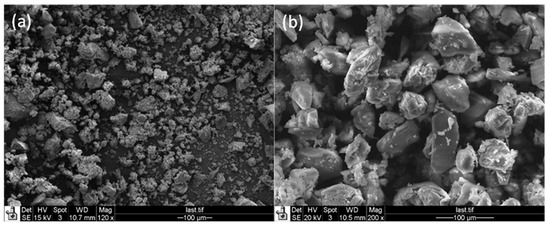 Furthermore, the zeolite Y beads obtained after aging for 8 days exhibited a significantly larger particle size, as visualized by scanning electron microscopy (SEM) in Figure 11b, compared to those aged for 5 days (Figure 11a). This observation aligns with previously reported findings in the literature regarding the effects of aging time [22,23,24]. SEM imaging clearly indicates that crystallization can be enhanced with prolonged aging time. After 5 days of aging, the sample particles displayed irregular morphologies, suggesting that the polyhedra were covered by an amorphous phase (Figure 11a). In contrast, after 8 days of aging (Figure 11b), the sample particles exhibited notably cleaner and more distinct polyhedron morphologies. However, as previously mentioned, this latter sample also contained other crystalline co-phases, leading to the formation of an inorganic composite rather than a pure zeolite Y phase.