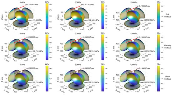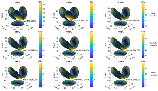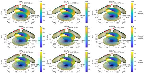 Similarly, the elasticity modulus, shear modulus and bulk modulus of the quartz crystal can be obtained according to Equations (8)–(10). In order to visualize the anisotropic properties of the material, the elastic modulus, shear modulus and bulk modulus of the material in each direction are represented by cloud diagrams. The same methodology is utilized to construct the distribution of the modulus surface and the projection plane diagram, as shown in Figure 2. Figure 10 shows the distribution of the bulk modulus, elastic modulus and shear modulus of quartz crystals at 0 MPa, 60 MPa and 120 MPa in all directions.